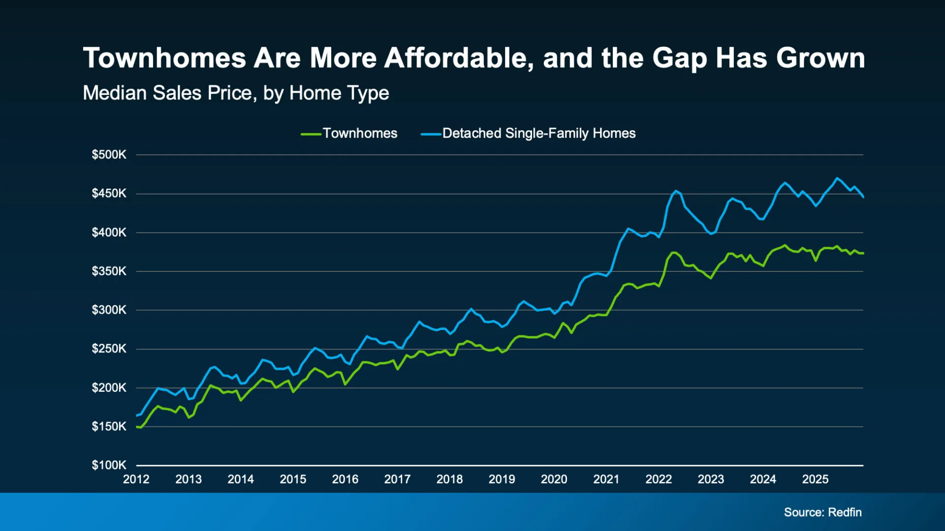 While prices vary by market, Redfin data shows townhomes are typically priced lower than detached single-family homes nationally. And that gap has grown in recent years as the supply of this type of home has grown too (see graph below):